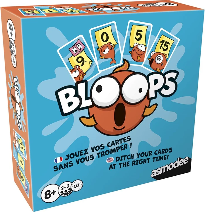 Dans ce jeu de défausse à l’aveugle, l’objectif est de finir avec le plus petit score. Vous commencez la partie avec 6 cartes face cachée, dont seulement 3 pourront être mémorisées.… Facile, non ? Jusqu’à ce qu’on vous les échange, qu’on vous en rajoute, ou que vous soyez trop occupé à vous réjouir des erreurs des autres pour vous rendre compte que vous avez perdu le fil ! À votre tour, piochez une carte. Gardez-la ou défaussez-la… mais attention?! Si vous remplacez une de vos cartes, faites-le sans la regarder. Une erreur ? C’est une pénalité. Les cartes défaussées peuvent déclencher des effets : ajouter une carte à un adversaire, échanger des cartes, en consulter une… et ce joyeux chaos est amplifié par la mécanique de contre-défausse : vous pouvez tous simultanément vous débarrasser de cartes identiques. Lorsque la carte 20 est jouée ou qu’un joueur crie «?Bloops !?», la partie est terminée et les scores sont révélés. Sauf si vous avez 3 cartes «?étoile?» ou plus : elles ne comptent pas ! Mémorisation, bluff et timing feront de vous le poisson roi du bocal. Petit et compact, Bloops va vous suivre partout pour des parties en famille ou entre amis.
