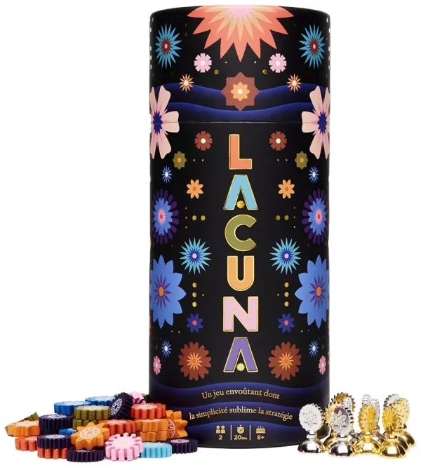 À tour de rôle, tracez une ligne imaginaire entre 2 fleurs, placez un pion n’importe où le long de cette ligne et collectez ces 2 fleurs. Pour gagner la partie, collectez une majorité de fleurs dans la majorité des couleurs ! Restez vigilants, car parmi les fleurs restantes, seules les plus proches de vos pions s’ajouteront à votre collection à la fin de la partie. Parviendrezvous à jouer chaque pion de manière stratégique et à obtenir la majorité des couleurs ? Entre réflexion, tension immersive et esthétique raffinée, Lacuna est une expérience ludique aussi profonde qu’élégante.
