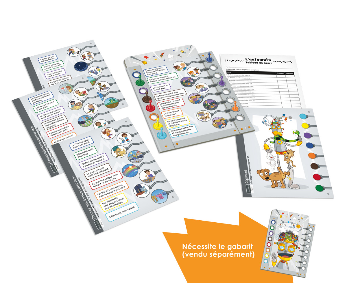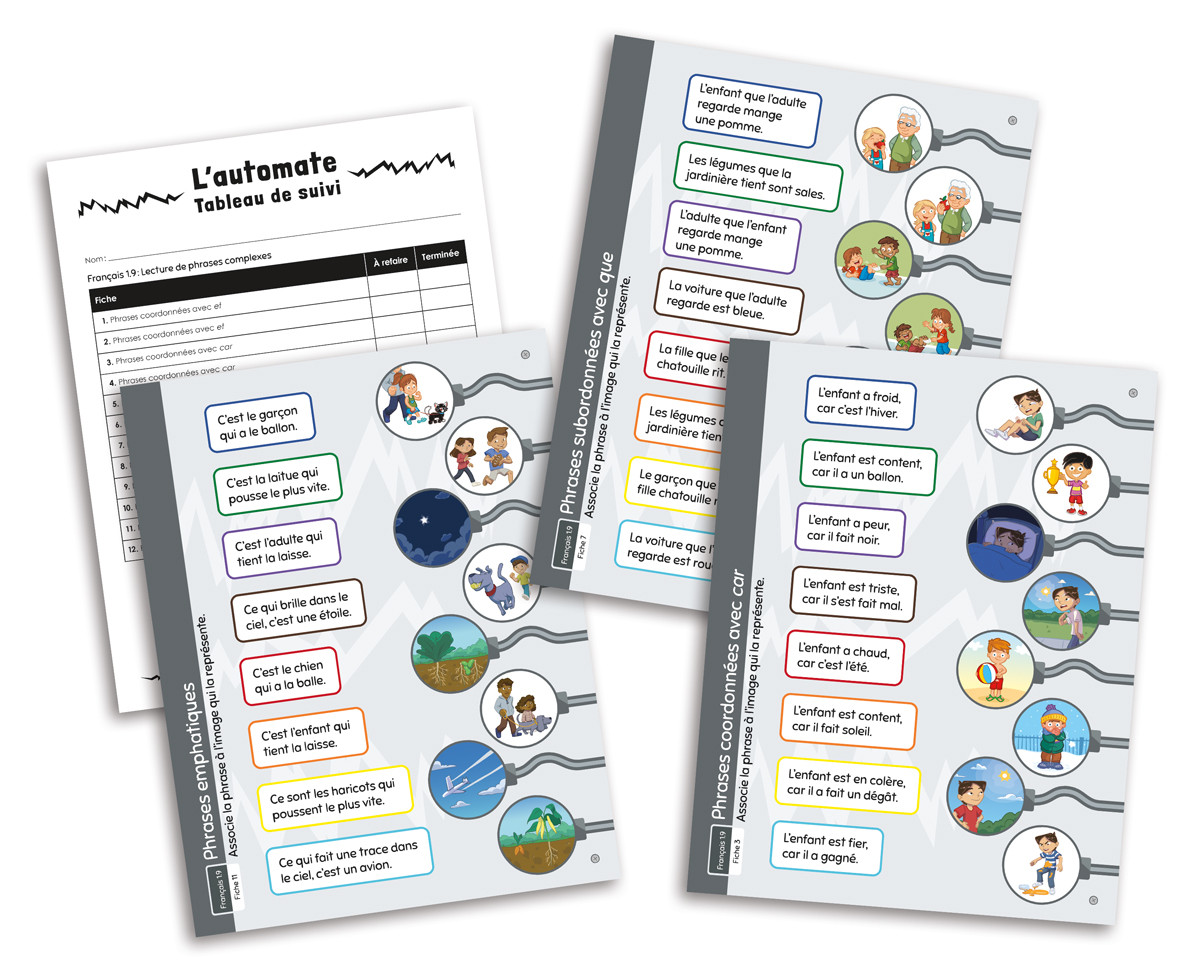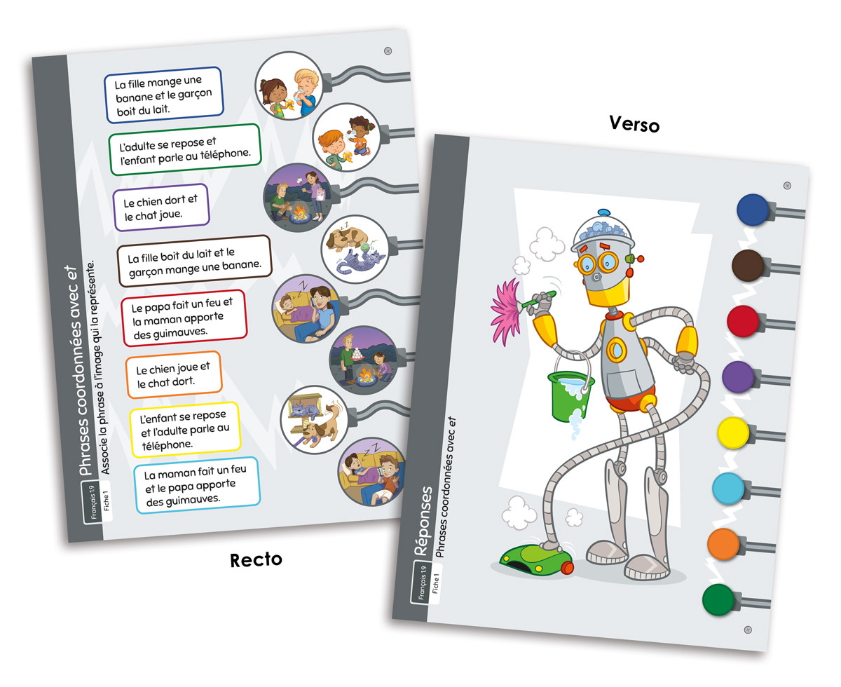 Jeu individuel d’association destiné aux élèves du 1er cycle du primaire ciblant l’habileté à lire et à comprendre des phrases complexes (phrases coordonnées avec «et», «car» et «mais», phrases subordonnées avec «que» et «qui» et phrases emphatiques). L’ensemble comprend 12 fiches de jeu dans lesquelles le joueur doit associer des phrases à des images pour assembler les fils dans la tête d’un robot et programmer ses actions.