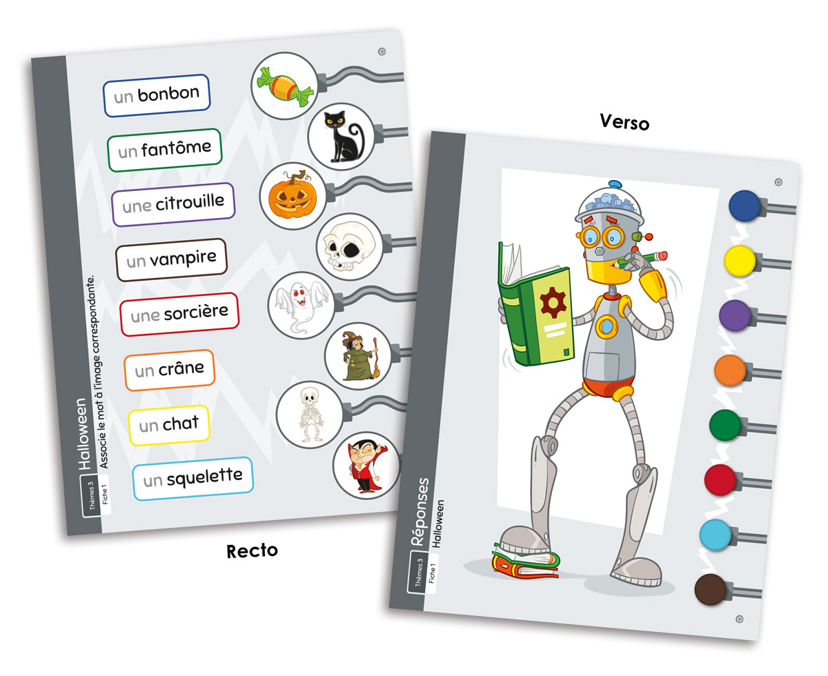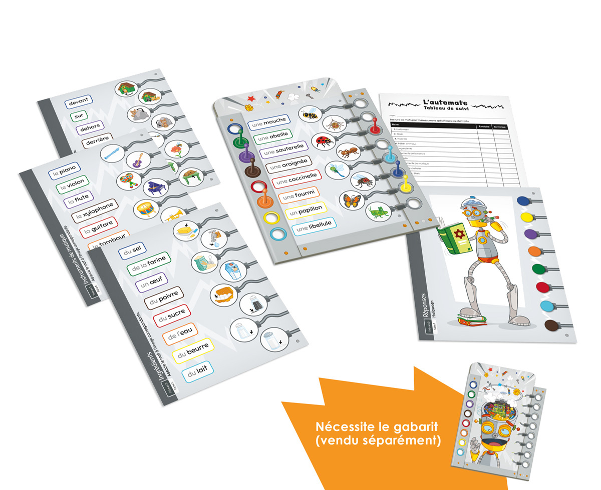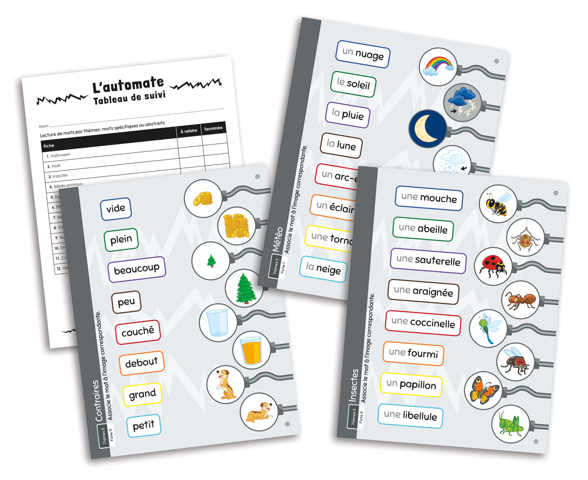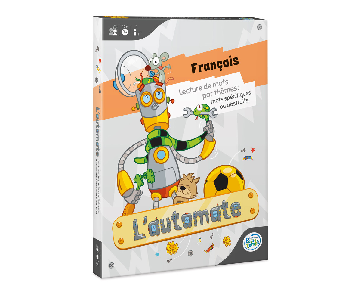Jeu individuel d’association ciblant le développement du vocabulaire en français langue seconde. Le joueur doit assembler les fils dans la tête du robot pour programmer ses actions. Les fiches du boitier L’automate – Lecture de mots par thèmes : mots spécifiques ou abstraits proposent chacune un réseau lexical axé sur un thème comprenant des mots spécifiques ou abstraits (ex. : ingrédients, notions spatiales, contraires). Des déterminants accompagnent les noms communs afin que les joueurs puissent développer leur connaissance du genre des mots en français (ex. : un œuf, la pluie).