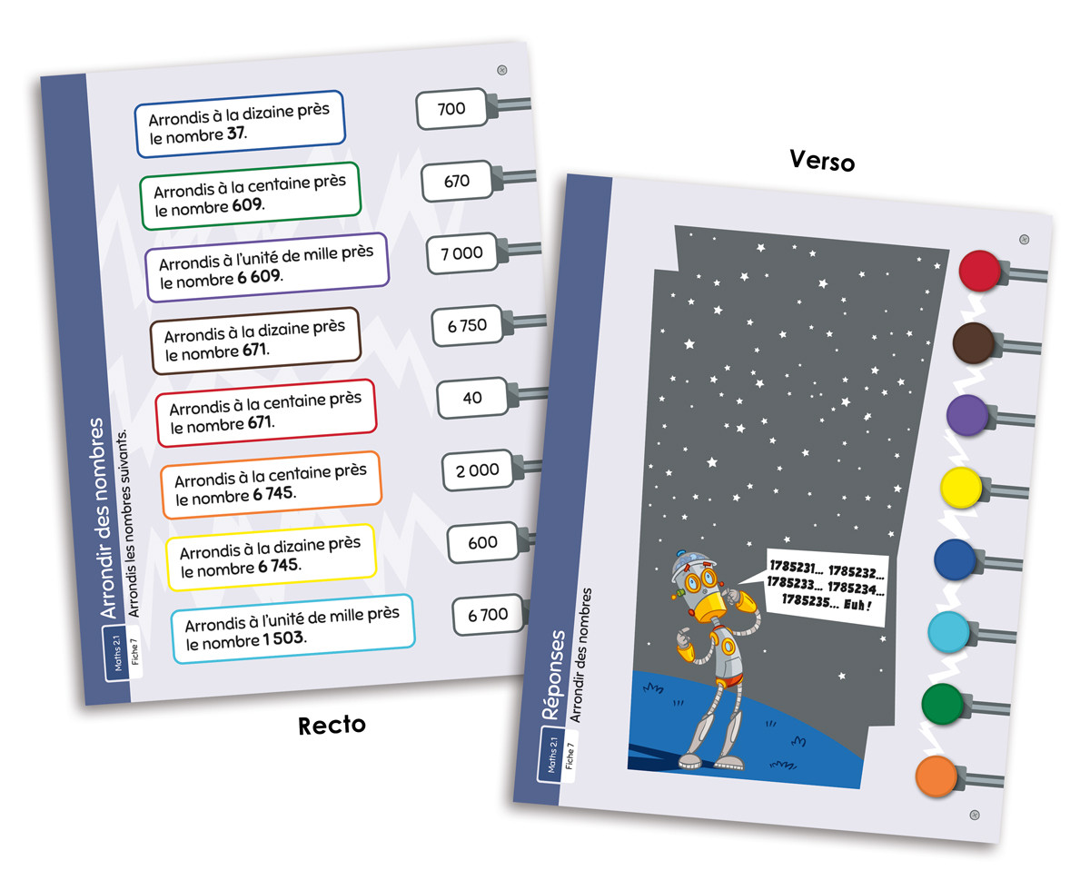 Les réponses de chaque fiche se trouvent au verso de celles-ci, ce qui permet au joueur de se corriger de façon autonome. Le jeu peut ainsi être utilisé de façon autonome, en ateliers, ou en contexte d’intervention, par exemple auprès d’élèves dyscalculiques. Un tableau de suivi reproductible permet également à l’intervenant de noter les fiches complétées par chaque joueur.