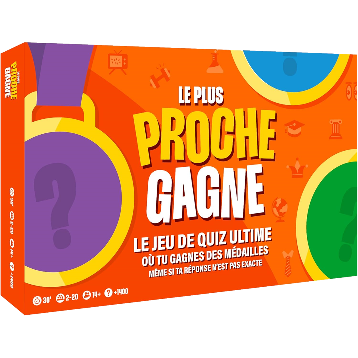 Avec Le Plus Proche Gagne, pas besoin de connaître la réponse exacte : il suffit de s’en rapprocher ! Affrontez vos proches dans ce jeu de quiz accessible, compétitif et coopératif pour toutes les générations. Le Plus Proche Gagne révolutionne les jeux de quiz avec un principe simple : toutes les réponses sont des nombres, et il suffit d’être le plus proche pour remporter la manche. Accessible à tous, ce jeu intergénérationnel mêle culture générale, stratégie et fun, le tout dans un format rapide et dynamique. Affrontez vos adversaires pour gagner des médailles dans l’une des 9 catégories, de L’HISTORIEN au GLOBE-TROTTEUR, et devenez le champion ultime ! Jouez en mode compétitif pour mettre la pression avec le sablier ou formez des équipes pour coopérer et répondre aux +1400 questions incluses. Idéal pour des parties rapides, Le Plus Proche Gagne est parfait pour animer vos soirées en famille ou entre amis. Qui sera le plus précis, ou tout simplement… le plus chanceux ?