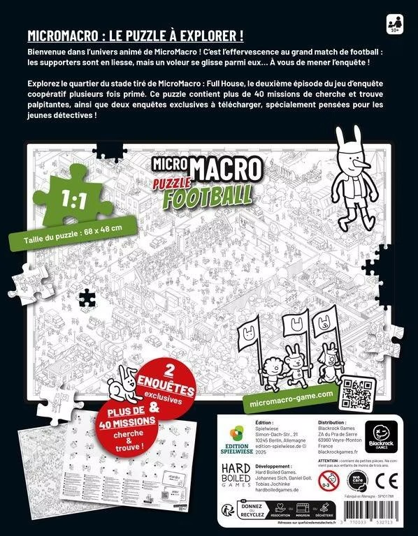 Dans ce puzzle de 500 pièces, vous découvrirez le plan détaillée du quartier de MicroMacro Full House, offrant une vue d’ensemble des rues et du stade de football. Mais ce n’est pas tout ! Il y a plus de 40 éléments à repérer sur la carte grâce à un «  »cherche et trouve » ». Revivez l’ambiance du match et ces mystères en assemblant les pièces du puzzle. Utilisez votre sens de l’observation pour trouver les 40 éléments ! »