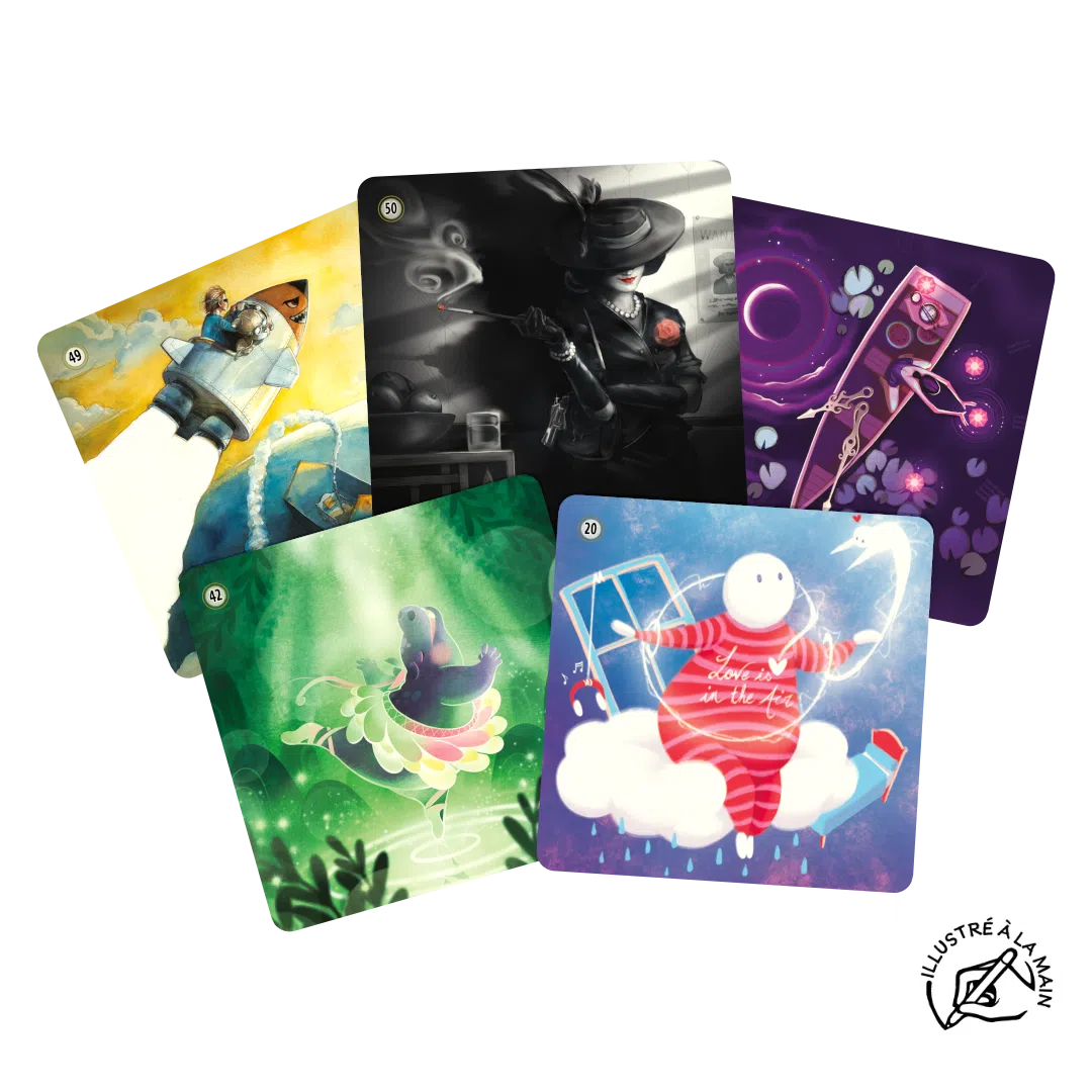 Magnifiques illustrations ! On découvre des détails des images à chaque partie. J’adore cette association mots-images ! Il fonctionne bien en famille, entre amis. Jeu calme mais avec tout de même l’enjeu de pouvoir « voler » le mot qu’un de nos adversaires convoitait.