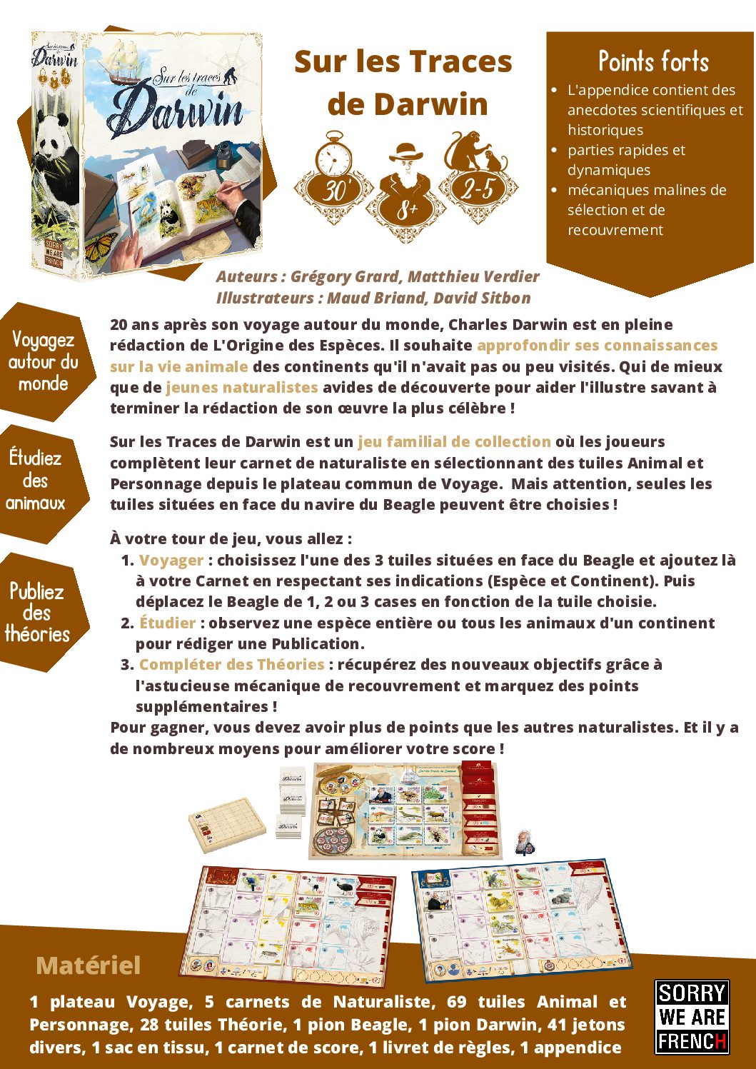 Sur les Traces de Darwin est un jeu familial pour 2 à 5 joueurs où des naturalistes complètent leur carnet en sélectionnant des tuiles Animal et Personnage depuis le plateau commun de Voyage. Mais attention, seules les tuiles situées en face du navire du Beagle peuvent être choisies !