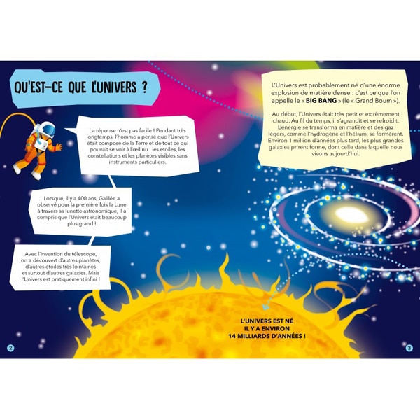 Reconstituez le magnifique puzzle circulaire de 200 pièces et, au fil des pages du livre de 32 pages, découvrez les fascinants mystères de notre univers ! Apprenez à reconnaître la Voie Lactée, observez les cratères de la Lune, suivez avec votre doigt la trajectoire des comètes et laissez votre imagination s’envoler au-delà de notre galaxie !